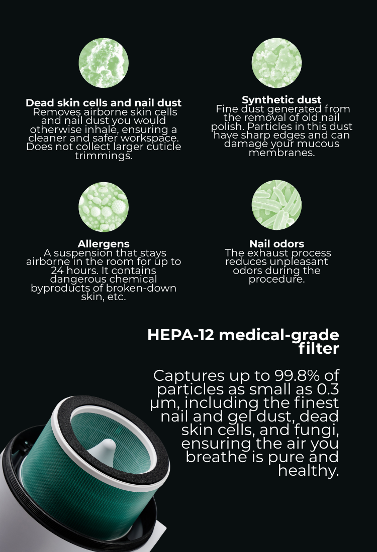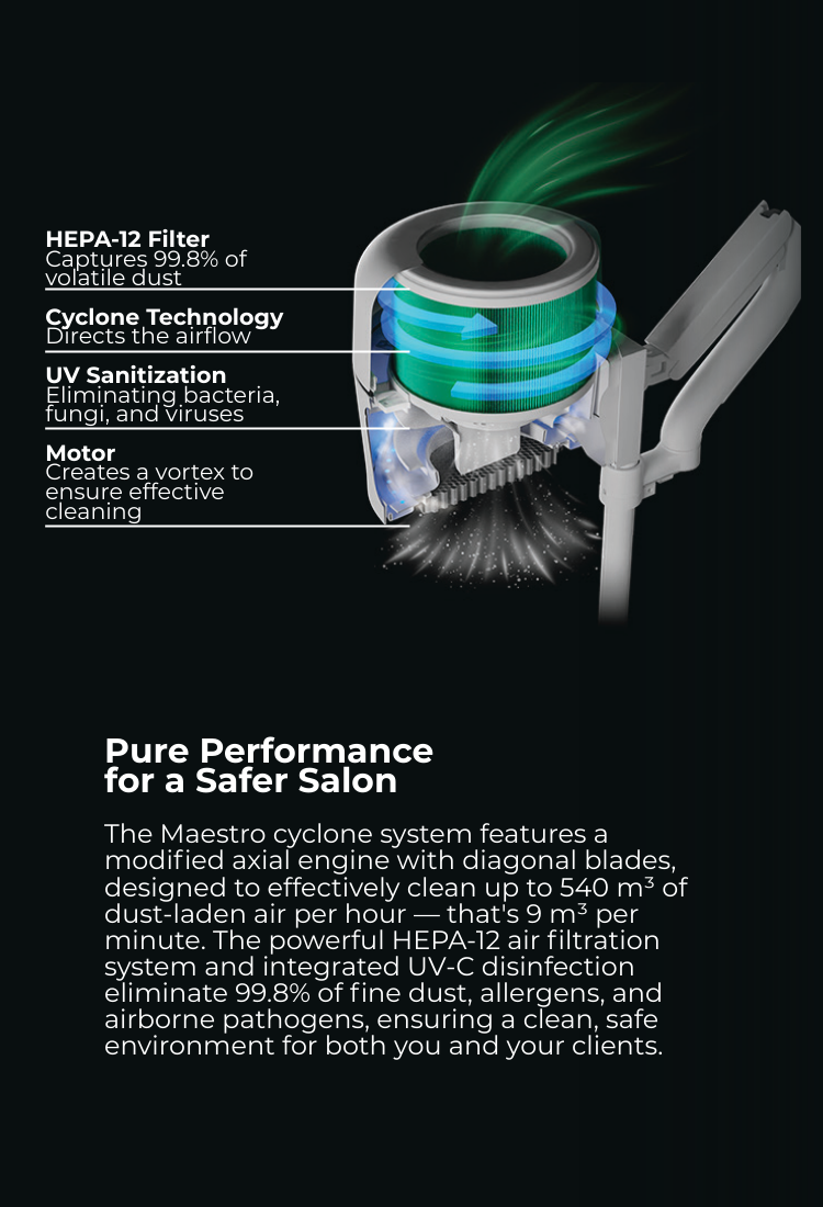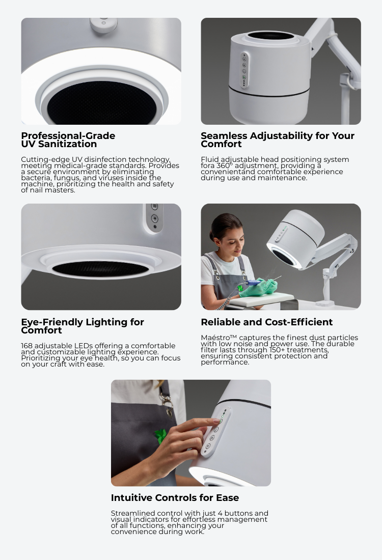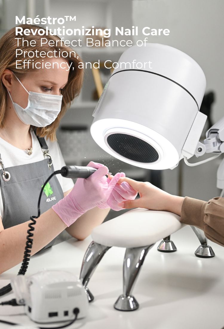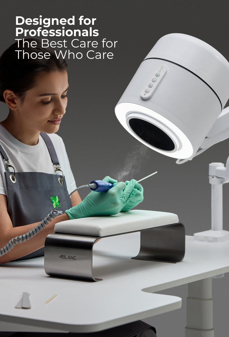 Maestro Ultimate Protection Nail Station by 4BLANC® uniquely combines efficiency with health protection for both professionals and clients. The compact device features a built-in dust collector, adjustable lighting, and UV disinfection. Maintaining health and workplace comfort during long-term manicure/pedicure procedures, ensuring a safer and more efficient procedural environment. Maestro offers unmatched workplace cleanliness and respiratory safety with its cyclone dust collection system, HEPA12 air filtration that captures 99.7% of microparticles, and UV disinfection to eliminate persistent pathogens. The flexible mounting options and high suction power define Maestro’s unique versatility, utilizing the Smart-Disc foot care procedures in manicure and pedicure/podiatry. Benefits include reduced professional health risks (especially lung diseases, allergy development, eye diseases), significantly improving nail technicians' comfort while saving workspace. Maestro reduces noise without compromising suction power, enhances client comfort, and thus boosts overall efficiency, productivity, and satisfaction with each procedure.