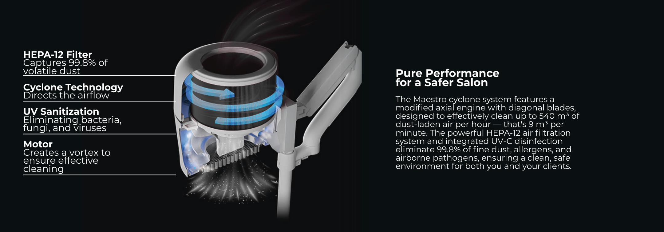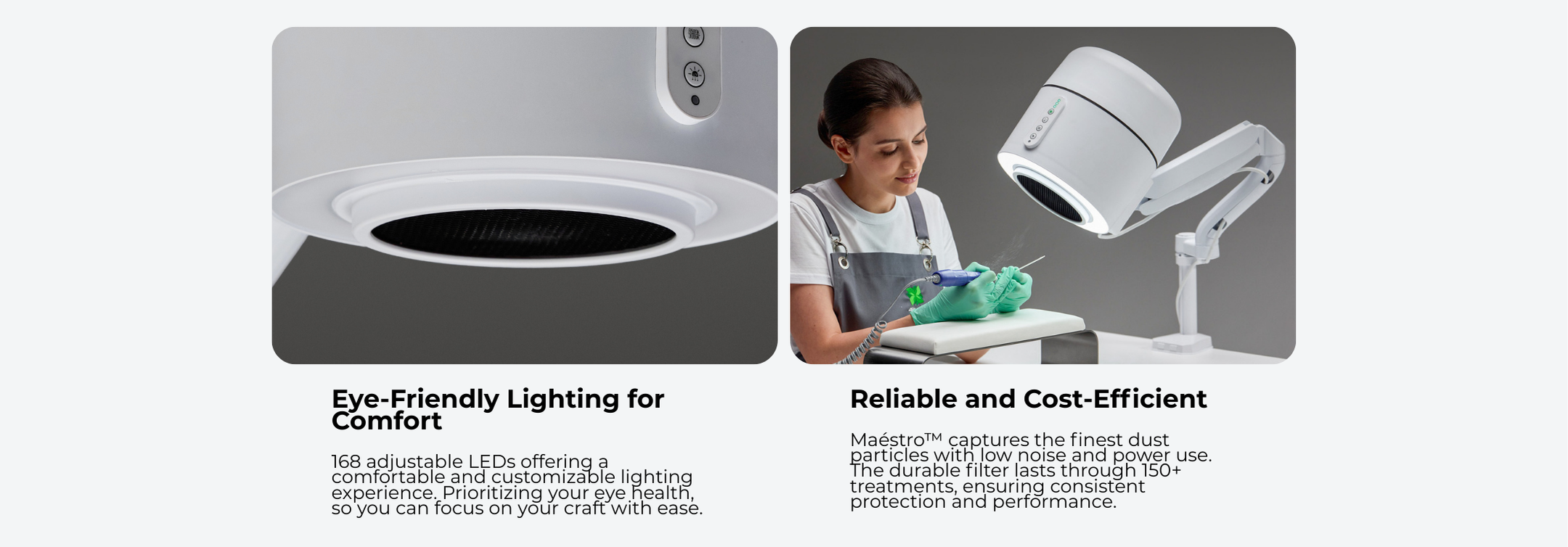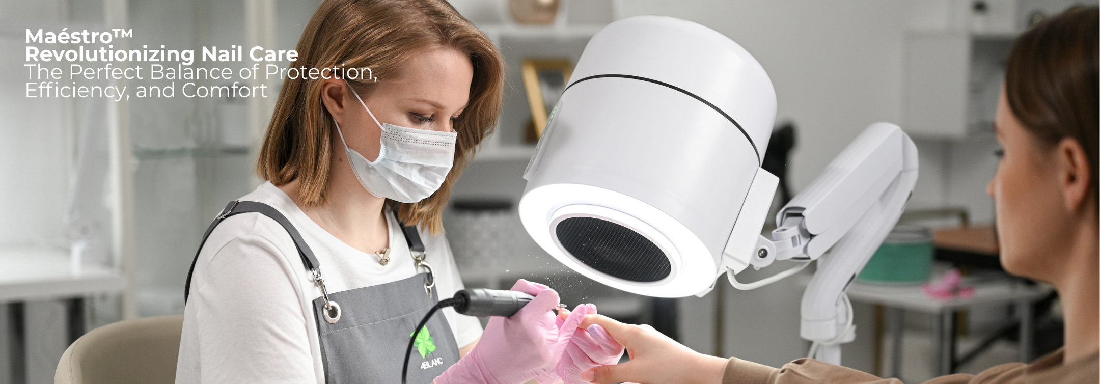 Maestro Ultimate Protection Nail Station by 4BLANC® uniquely combines efficiency with health protection for both professionals and clients. The compact device features a built-in dust collector, adjustable lighting, and UV disinfection. Maintaining health and workplace comfort during long-term manicure/pedicure procedures, ensuring a safer and more efficient procedural environment. Maestro offers unmatched workplace cleanliness and respiratory safety with its cyclone dust collection system, HEPA12 air filtration that captures 99.7% of microparticles, and UV disinfection to eliminate persistent pathogens. The flexible mounting options and high suction power define Maestro’s unique versatility, utilizing the Smart-Disc foot care procedures in manicure and pedicure/podiatry. Benefits include reduced professional health risks (especially lung diseases, allergy development, eye diseases), significantly improving nail technicians' comfort while saving workspace. Maestro reduces noise without compromising suction power, enhances client comfort, and thus boosts overall efficiency, productivity, and satisfaction with each procedure.