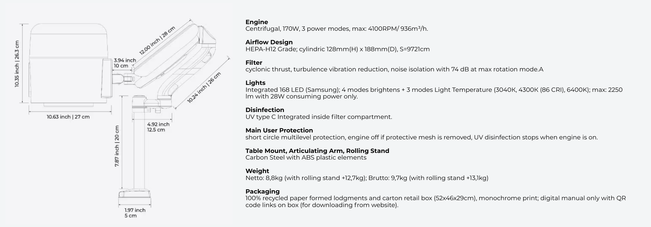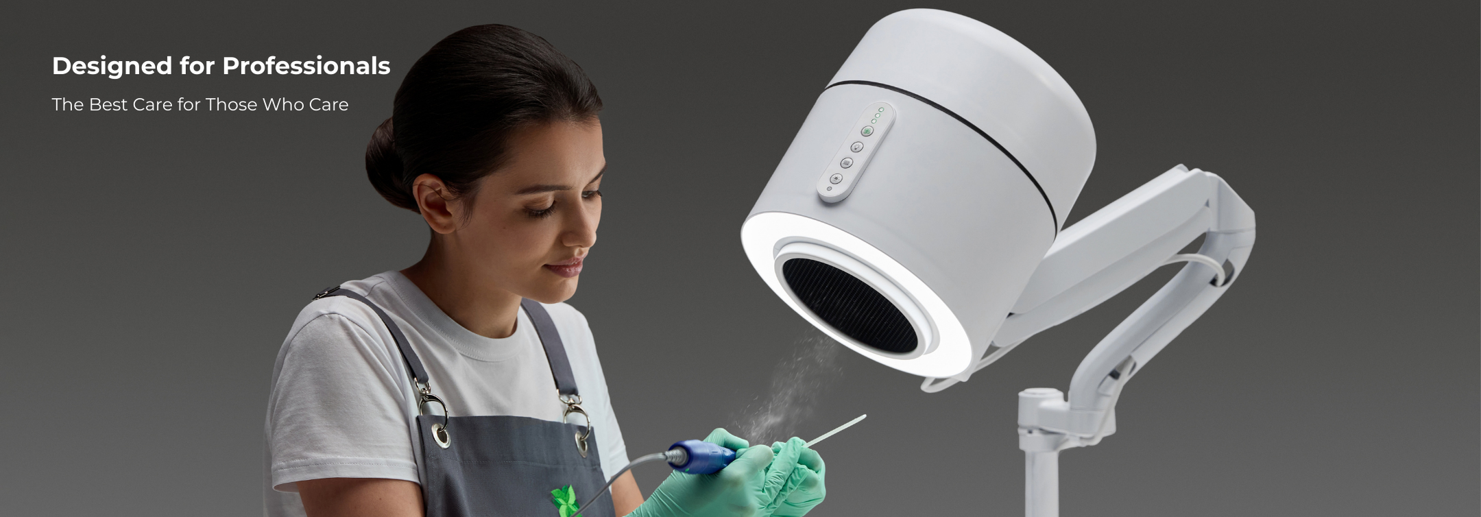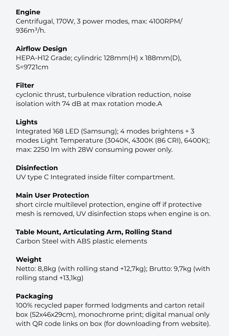 - Design: Cylindrical ergonomic body for intuitive/easy operation; control devices on the body (considering glove handling), convenient placement on a hinged counterweight lever for easy angle adjustment for better suction and light, desk mounting system requires only 10 cm² of workspace (manicure station), optional mounting on a rolling stand for movement (pedicure station).