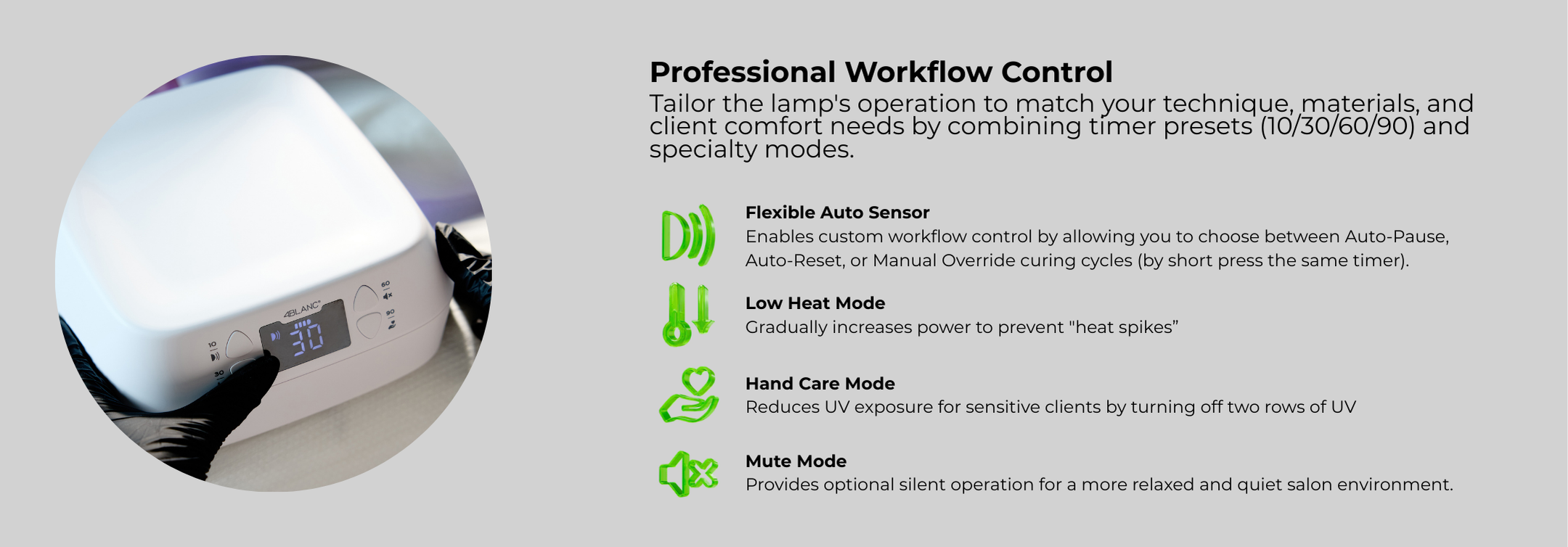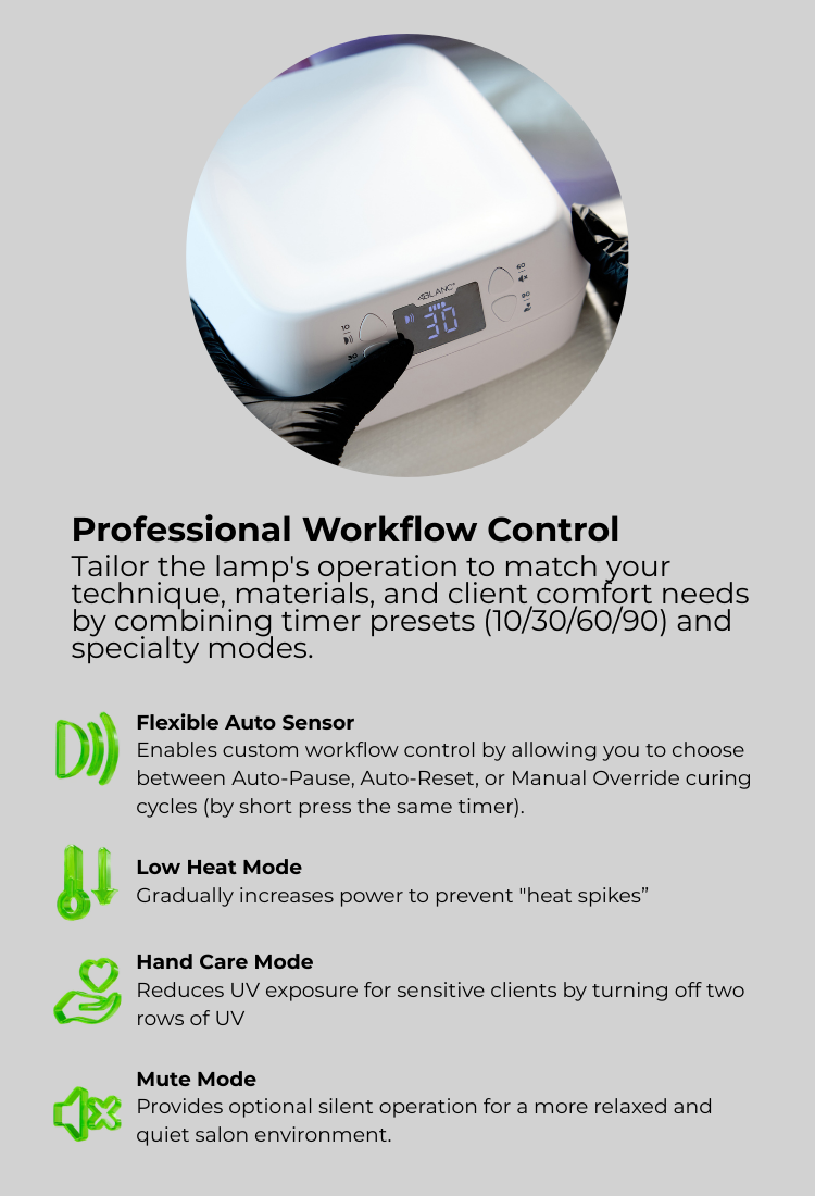 ✔ Versatile curing modes – 10 / 30 / 60 / 90 s timers, automatic motion sensor, manual control, and Low Heat mode for sensitive nails