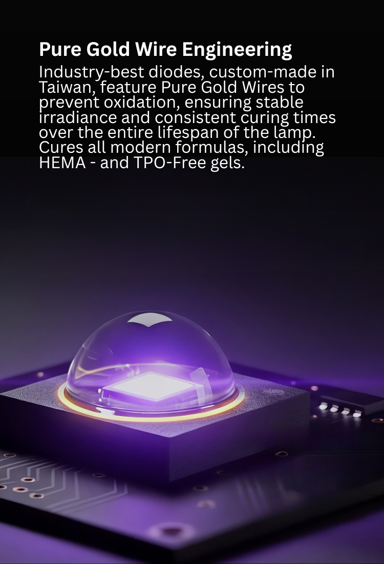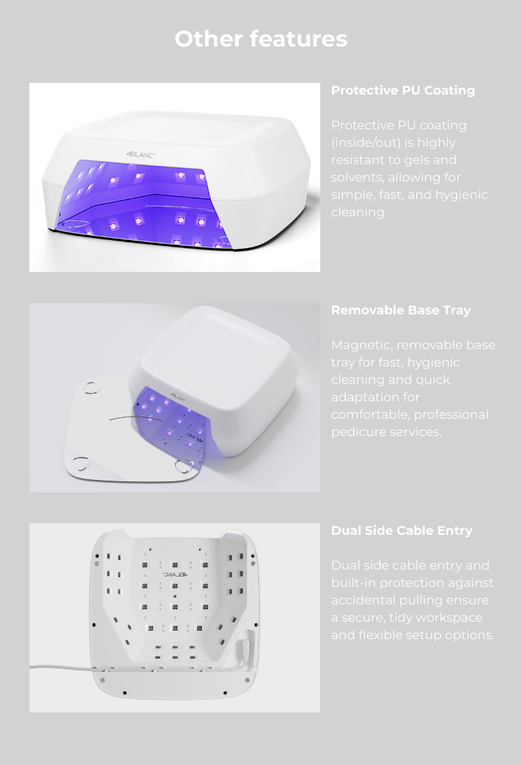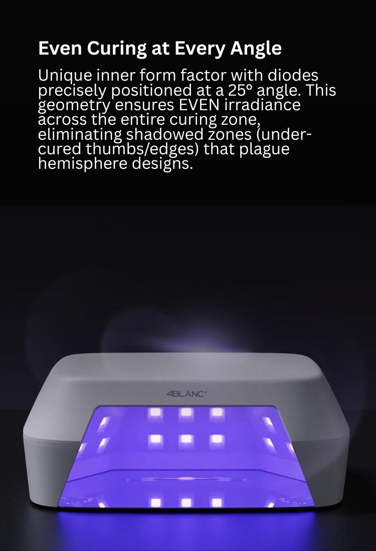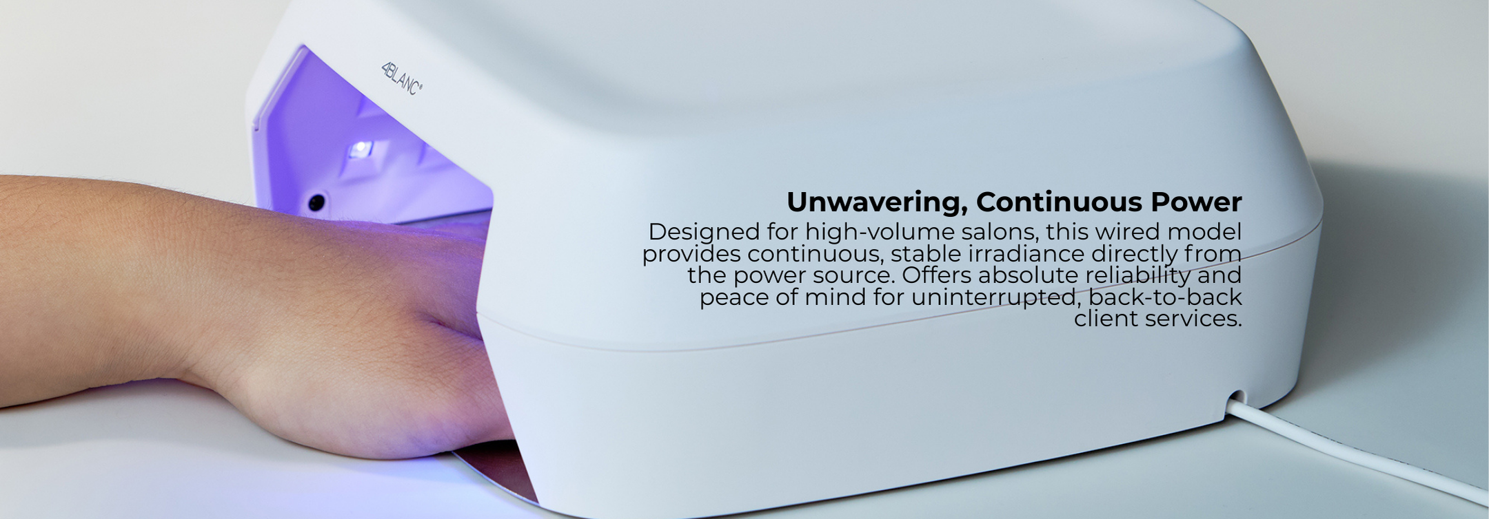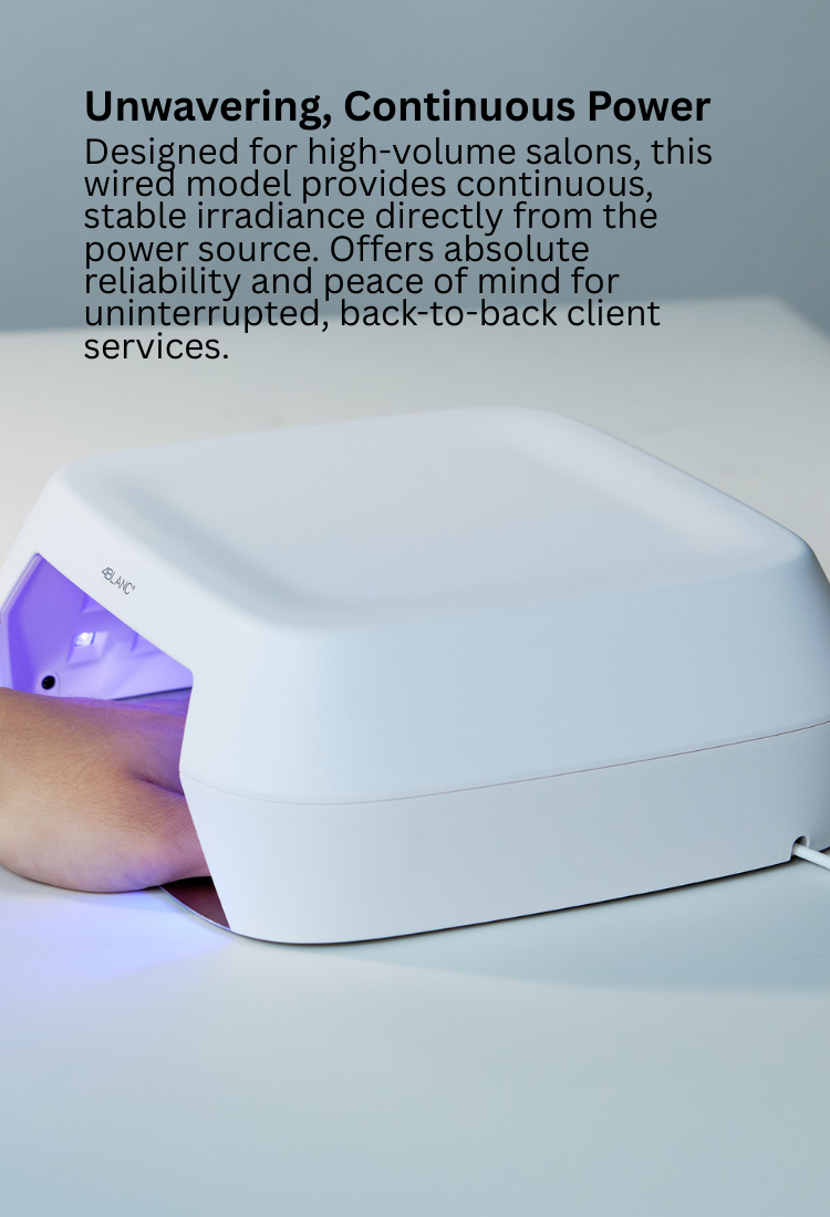 The 4BLANC Smart is a wired UV/LED nail lamp designed for both professional and home use, delivering fast and even curing of all gel products. Featuring Pure Gold Wire technology, it ensures stable and consistent light output throughout the lamp’s lifespan.