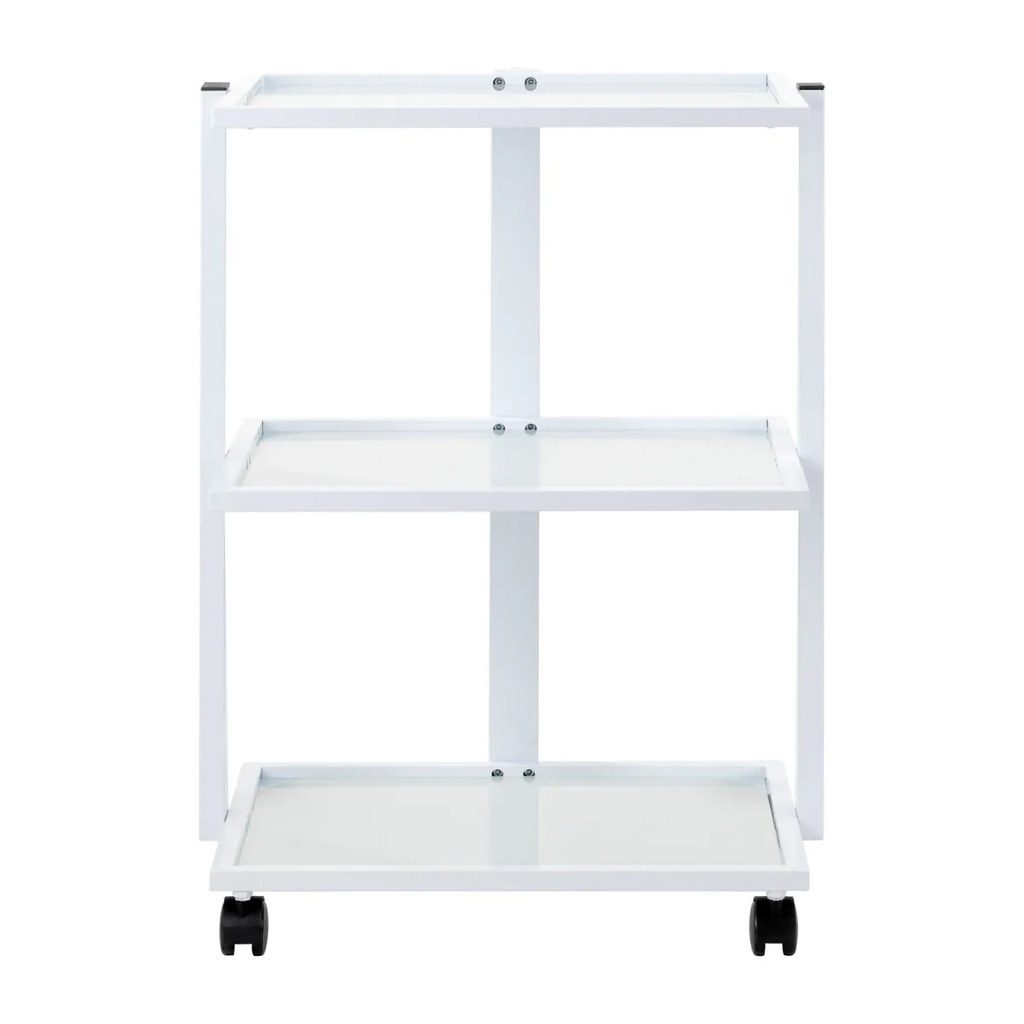 Constructed with a durable white-toned aluminum frame and glass shelves, this table blends elegance with functionality. Smooth surfaces are easy to clean, and four wheels allow effortless repositioning within the treatment area. The frame also includes a dedicated mount for attaching a professional magnifying lamp.
