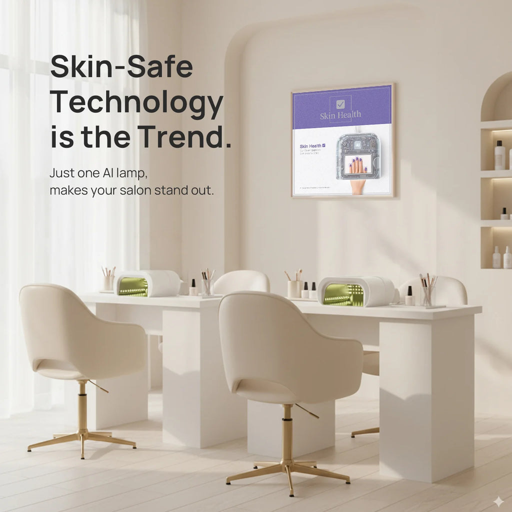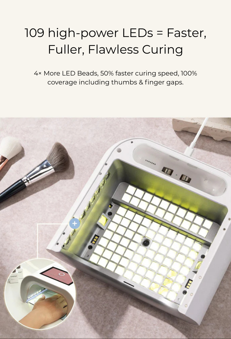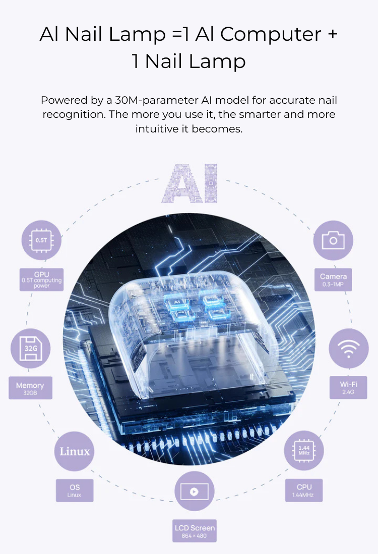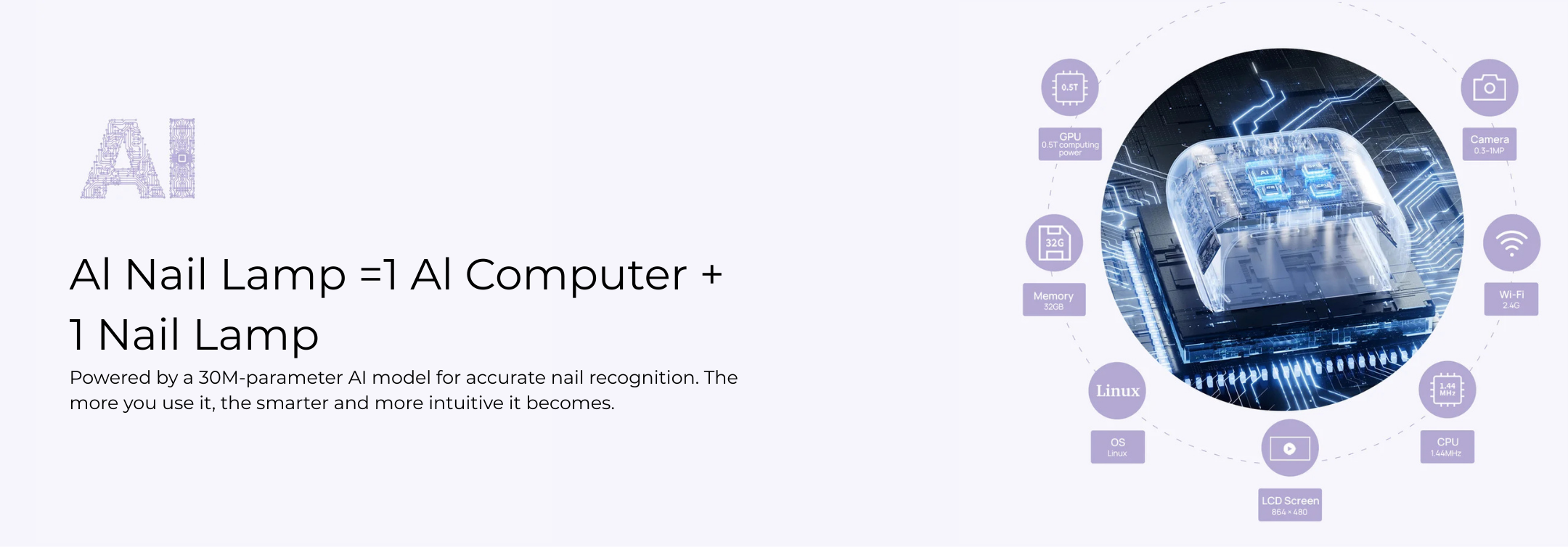 Sensors and AI technology. The lamp is equipped with sensors, an AI camera, and a grid of 109 LEDs. When a hand is placed inside, the sensors detect finger position and the LEDs activate precisely, directing light only to the nail plate. If the hand is moved or a single finger is placed, the LEDs adapt automatically. This ensures that light reaches only the nail, avoiding skin and protecting the eyes from harmful UV radiation. The built-in display shows the light direction in real time. LEDs last twice as long — up to 2 years without power loss — since in AI mode they work alternately. If the hand is positioned incorrectly, the device gives on-screen or voice tips, which can be muted. This guarantees even curing, up to 50% faster. The lamp’s lifetime is estimated at 2–5 years in salons and up to 10 years for personal use.