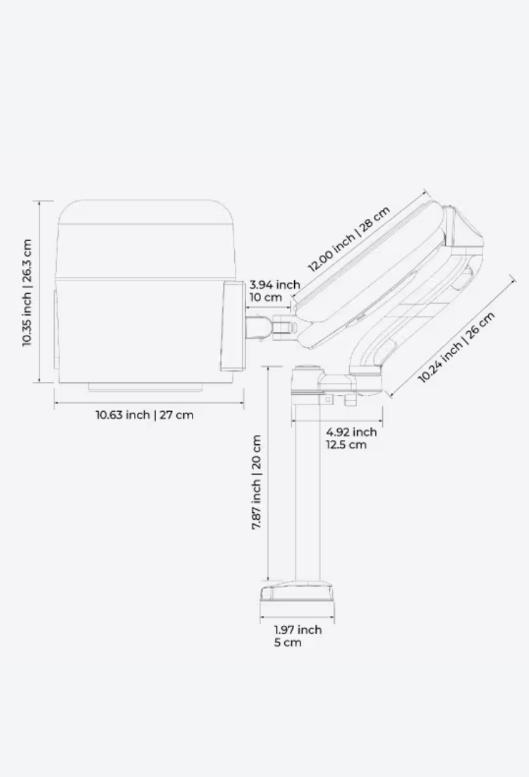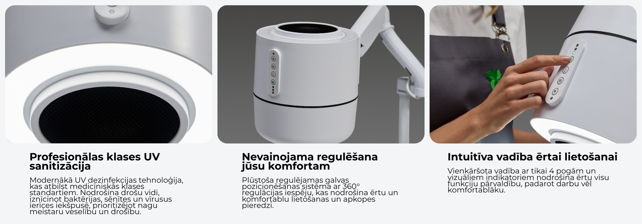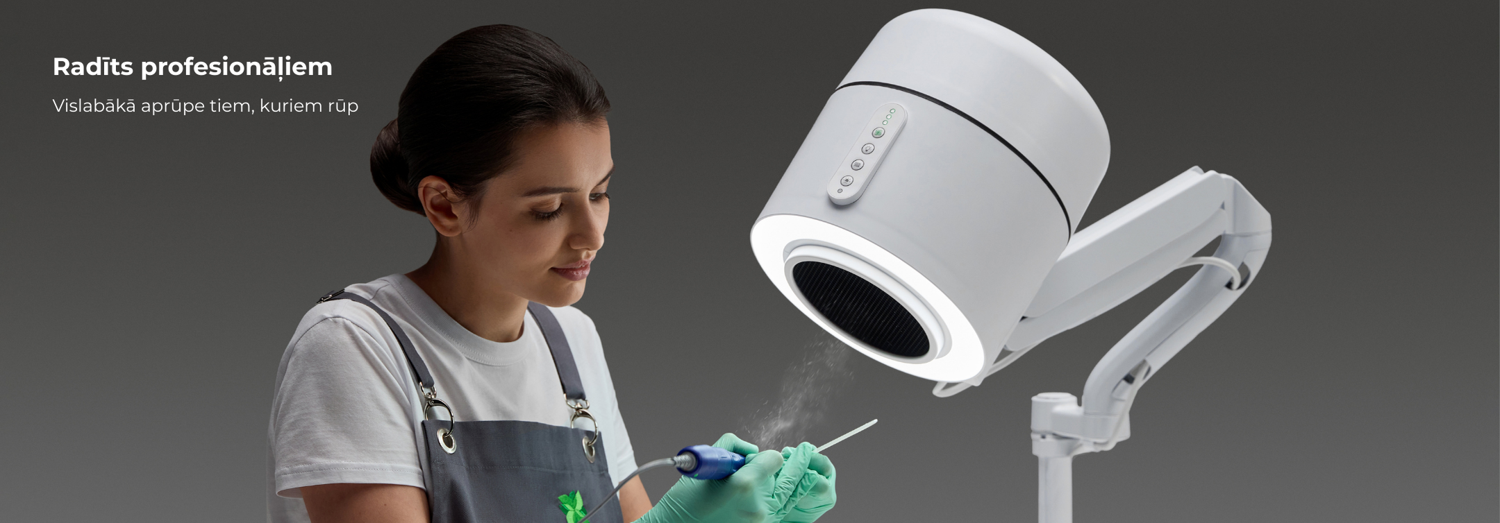 - Dizains: cilindrisks ergonomisks korpuss, kas vērsts uz intuitīvu/vienkāršu darbību; uz ķermeņa esošās vadības ierīces (ņemot vērā roku darbināšanu ar cimdiem), ērta novietošana uz šarnīrveida pretsvara sviras ērtai leņķa regulēšanai labākai sūkšanai un gaismai, galda stiprinājuma sistēmai nepieciešams tikai 10 cm² darba vietas malā (manikīra stacija), izvēles stiprinājums uz ritošā statīva pārvietošanai (pedikīra stacija).