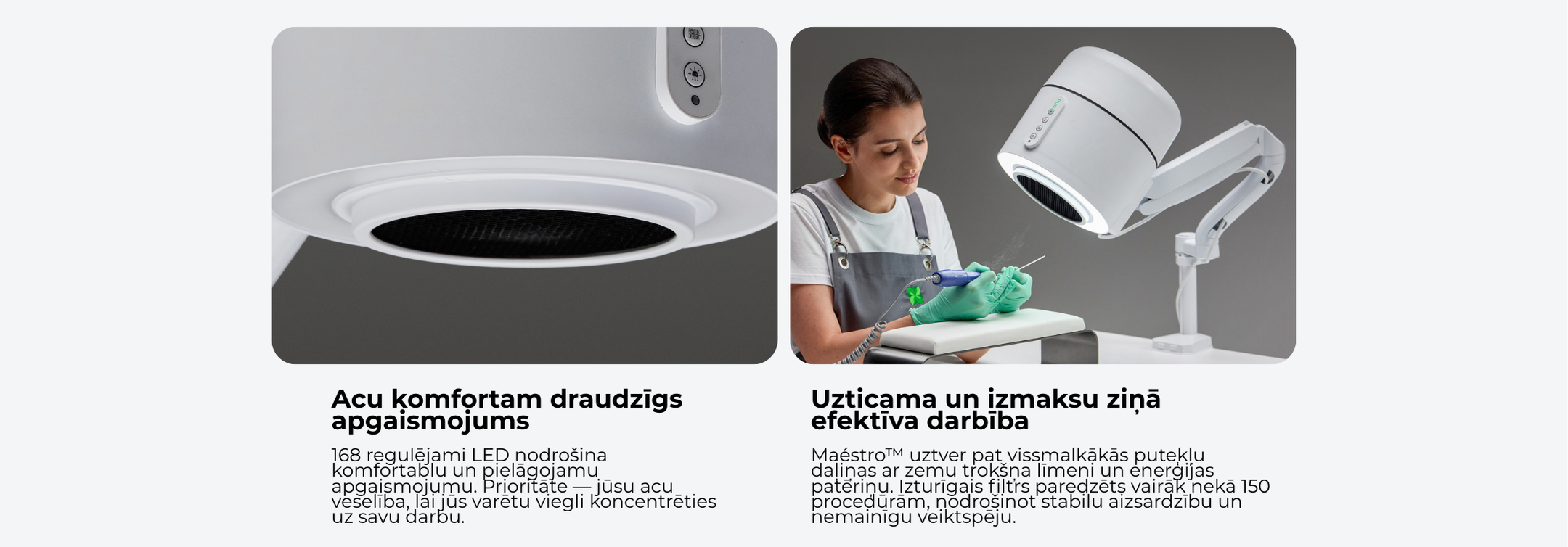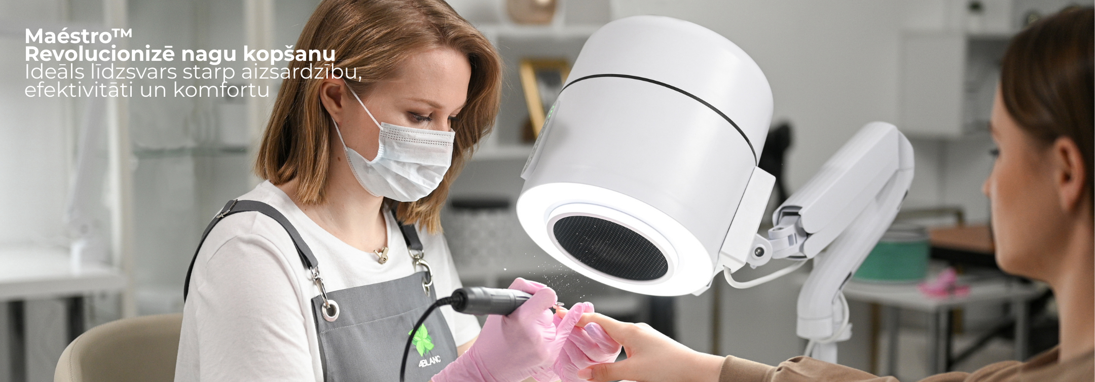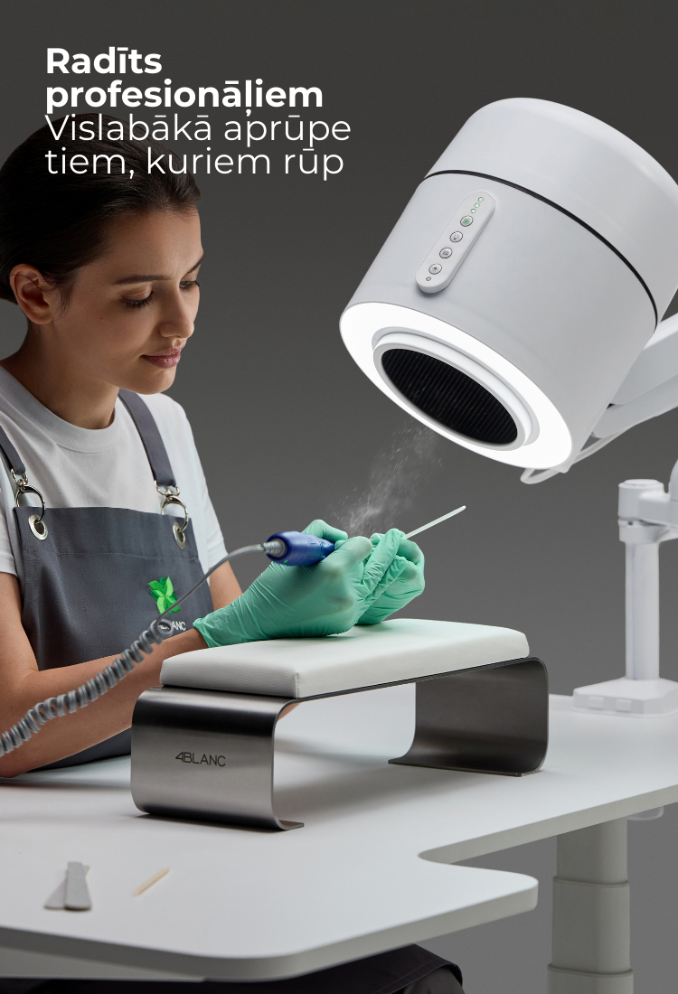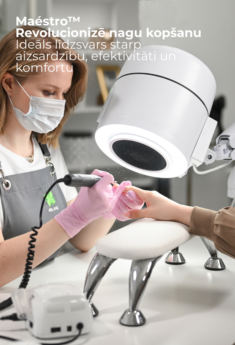 Maestro Ultimate Protection Nail Station no 4BLANC® unikāli apvieno efektivitāti ar veselības aizsardzību meistariem un klientiem. Kompaktajā ierīcē ir iebūvēts putekļu savācējs, regulējams apgaismojums un UV dezinfekcija. Veselības un darba telpas komforta saglabāšana ilgtermiņā manikīra/pedikīra procedūru laikā, nodrošinot drošāku un efektīvāku procedūru vidi. Maestro piedāvā nepārspējamu darba vietas tīrību un elpošanas drošību ar ciklona putekļu savākšanas sistēmu, HEPA12 gaisa filtrāciju, kas uztver 99,7% mikrodaļiņu, un UV dezinfekciju, lai novērstu pastāvīgos patogēnus. Elastīgas montāžas iespējas un liela sūkšanas jauda nosaka Maestro unikālo daudzpusību, izmantojot nagu un pedikīra/podoloģijas Smart-Disc pēdu kopšanas procedūras. Ieguvumi ietver samazinātus profesionālos veselības riskus (jo īpaši: plaušu slimības, alerģiju attīstību, acu slimības), ievērojami palielinot nagu meistaru darba komfortu, vienlaikus ietaupot darba vietu. Maestro rada zemāku troksni, nesamazinot sūkšanas jaudu, uzlabo klientu komfortu un tādējādi uzlabo kopējo efektivitāti, produktivitāti un katras procedūras apmierinātību.