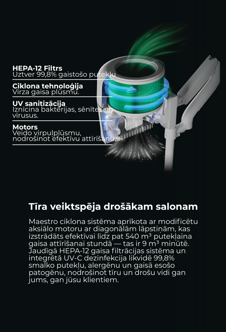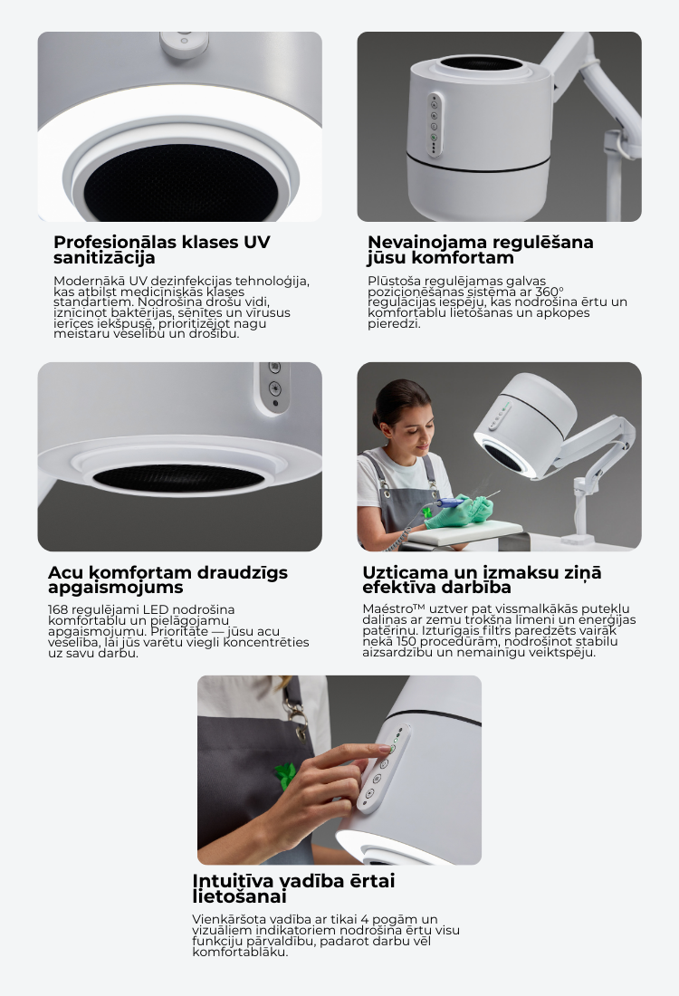 Maestro ir inovatīvs, visaptverošs nagu salona risinājums, kas uzsver veselības aizsardzību un labklājību darba vietā. Tas piedāvā augstu efektivitāti ar zemu enerģijas patēriņu, integrējot vairākas funkcijas un pielāgojamību. Funkcijas ietver jaudīgu putekļsūcēju nagu, gela un ādas daļiņu uztveršanai ar izcilu sūkšanas jaudu un zemu trokšņa līmeni, gaisa filtrēšanas sistēmu HEPA-12 smalkāko putekļu un smaku aizturēšanai, UV dezinfekciju, regulējamu apļa gaismu ērtam apgaismojumam, aizsardzības sistēmu pat iesācējiem un elastīgu stiprinājumu dažādām procedūrām. Maestro nodrošina drošāku, daudzpusīgāku vidi gan nagu tehniķiem, gan klientiem, uzlabojot gan pakalpojumu kvalitāti, gan drošību.