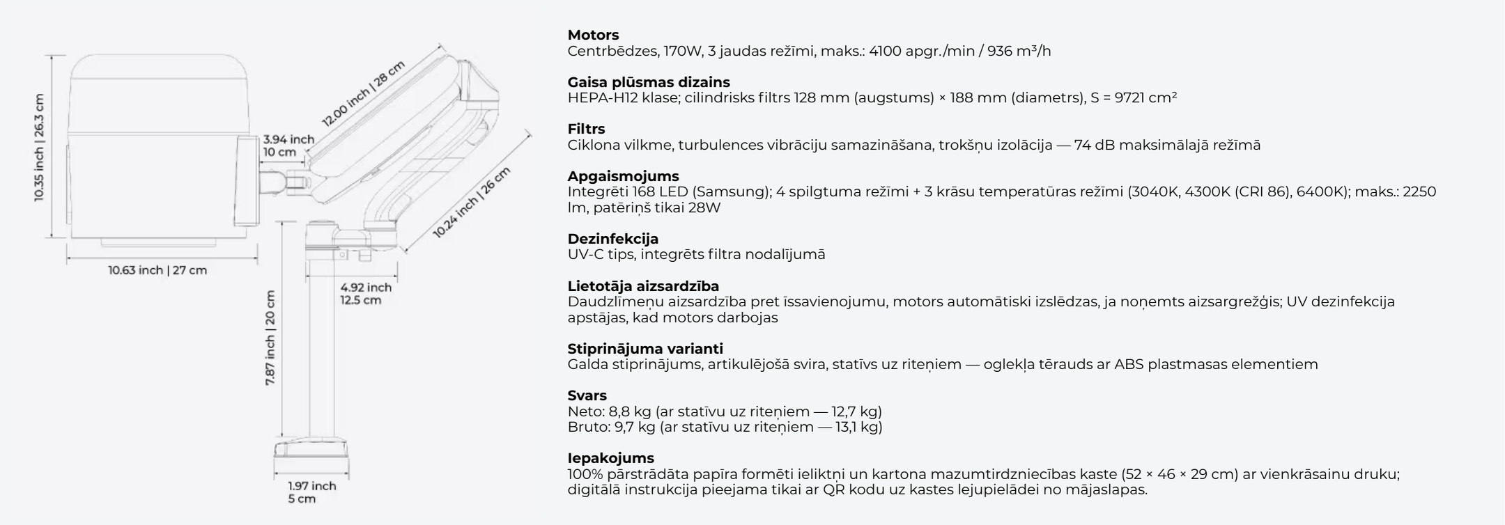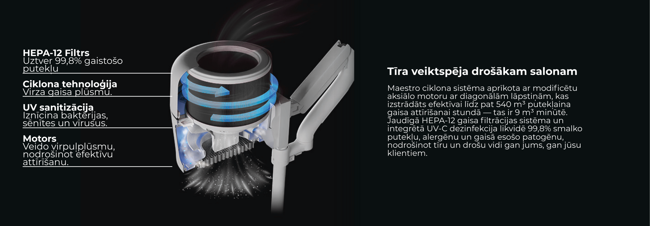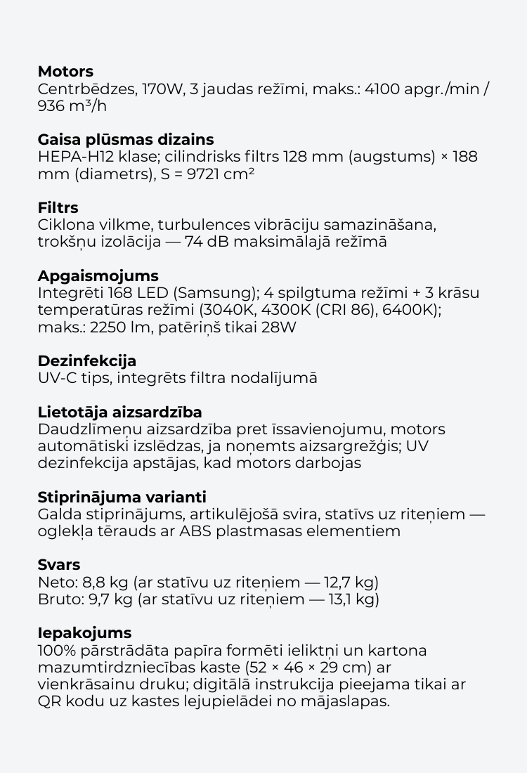 - Filtrs: HEPA-H12 klase; cilindrisks 128mm(H)x188mm(D), S=9721cm.