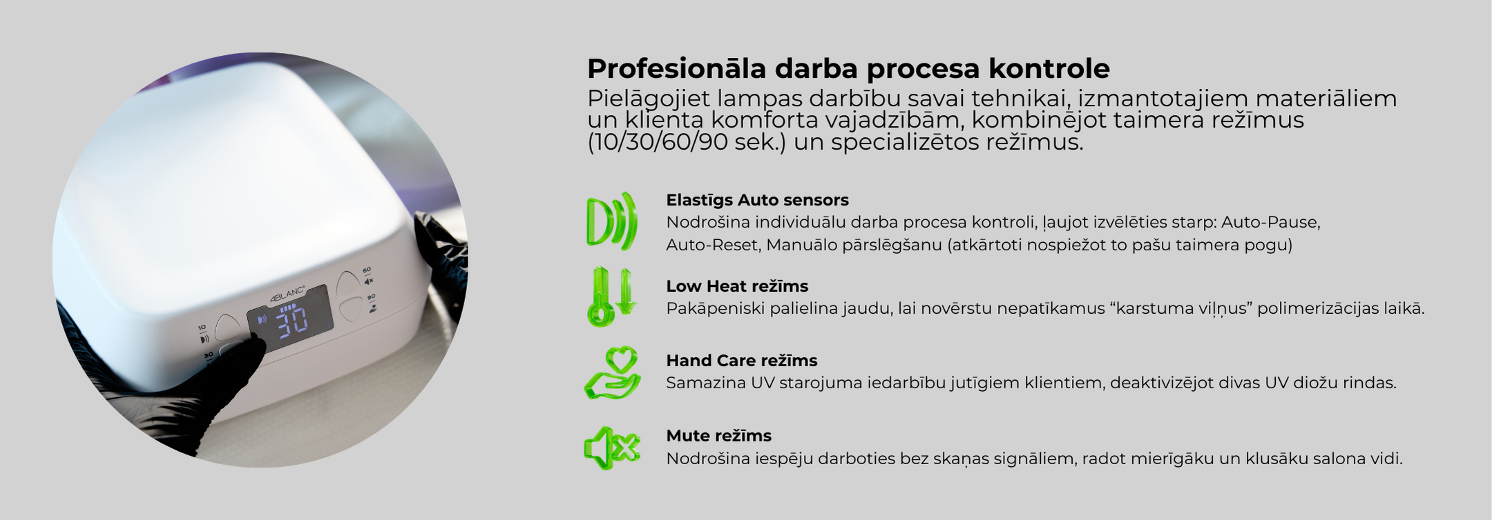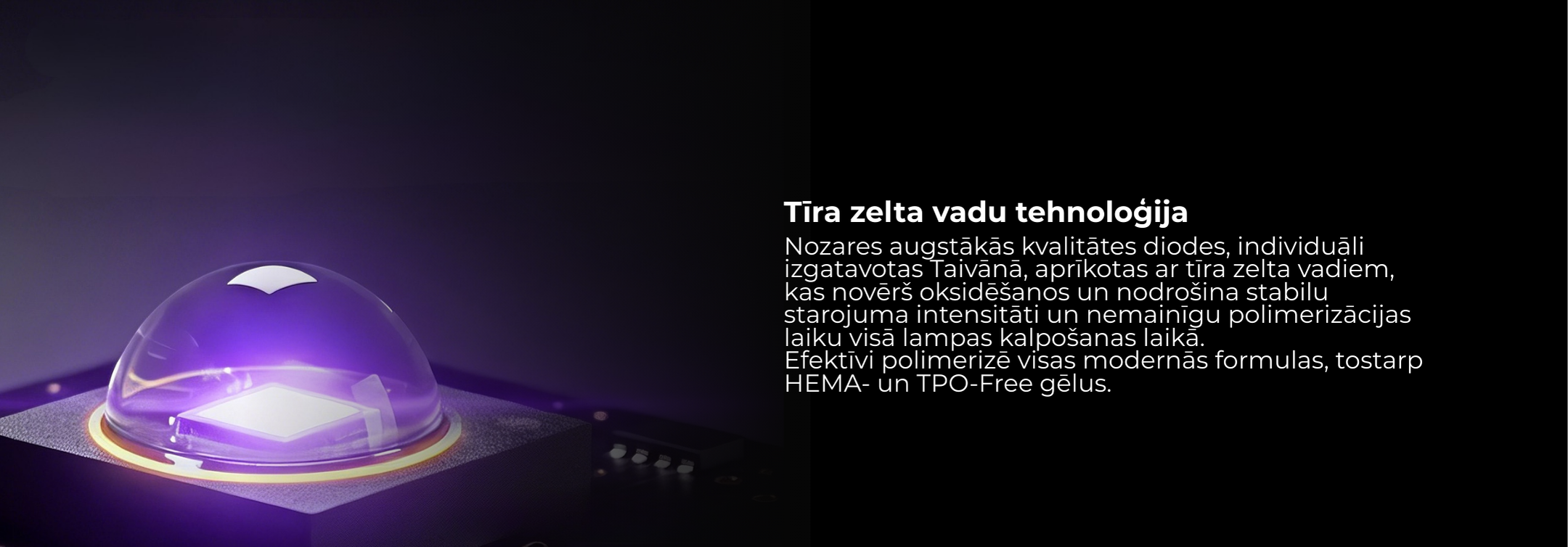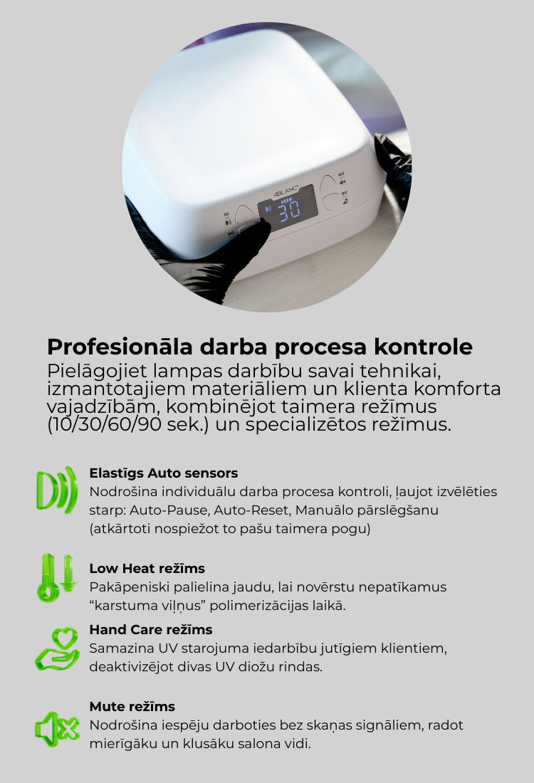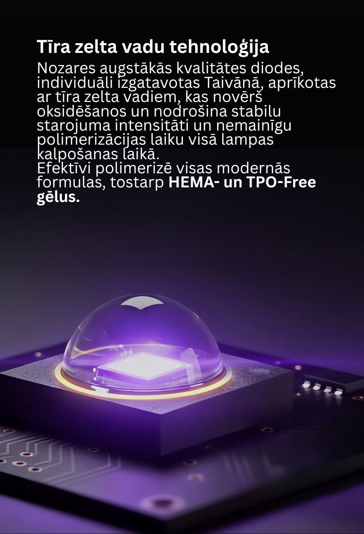 ✔ Mitmekülgsed polümerisatsioonirežiimid – taimerid 10 / 30 / 60 / 90 s, automaatne liikumisanduri aktiveerimine, manuaalne juhtimine ja Low Heat režiim tundlikele küüntele