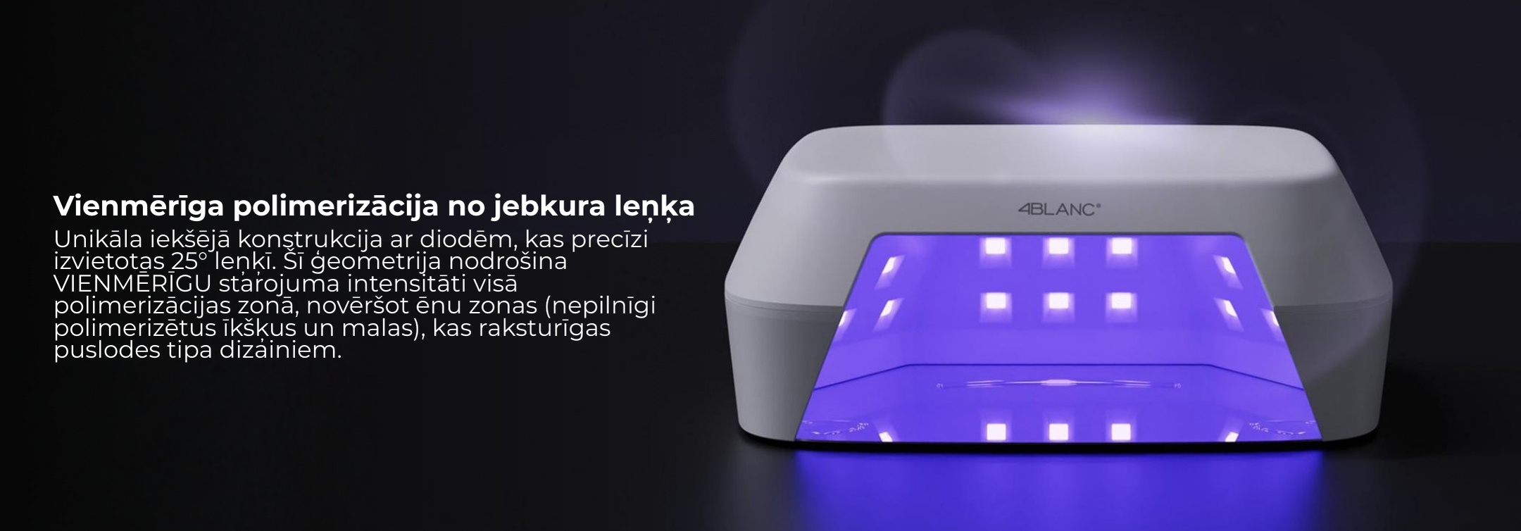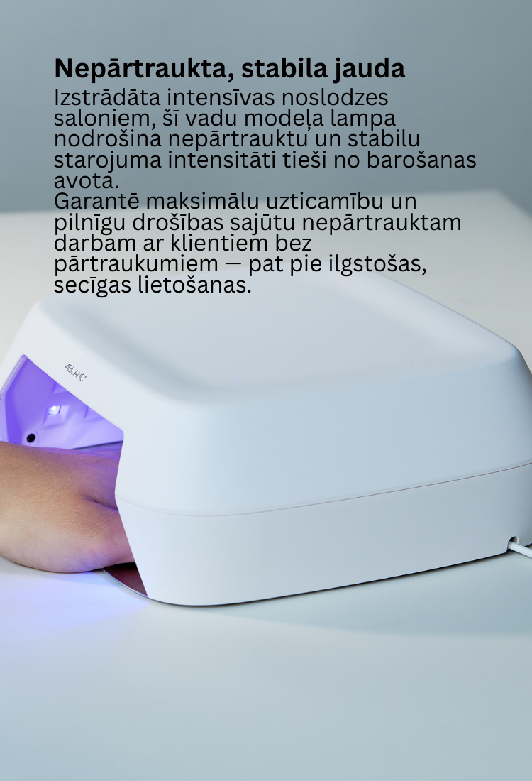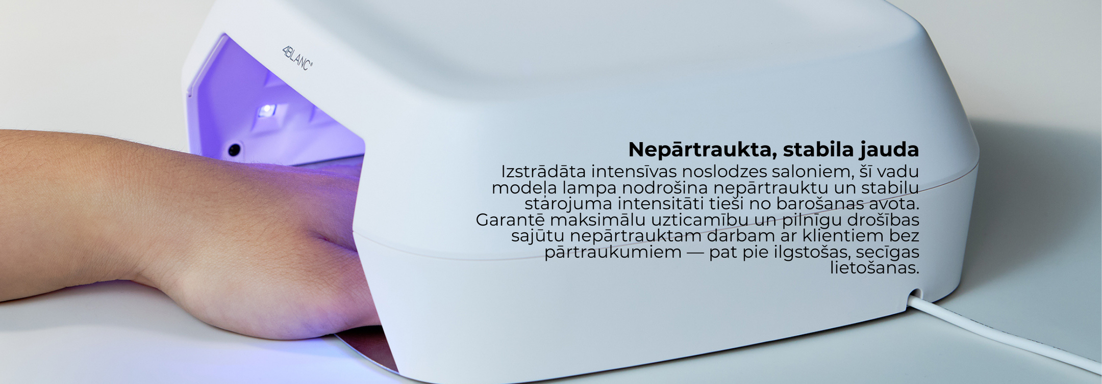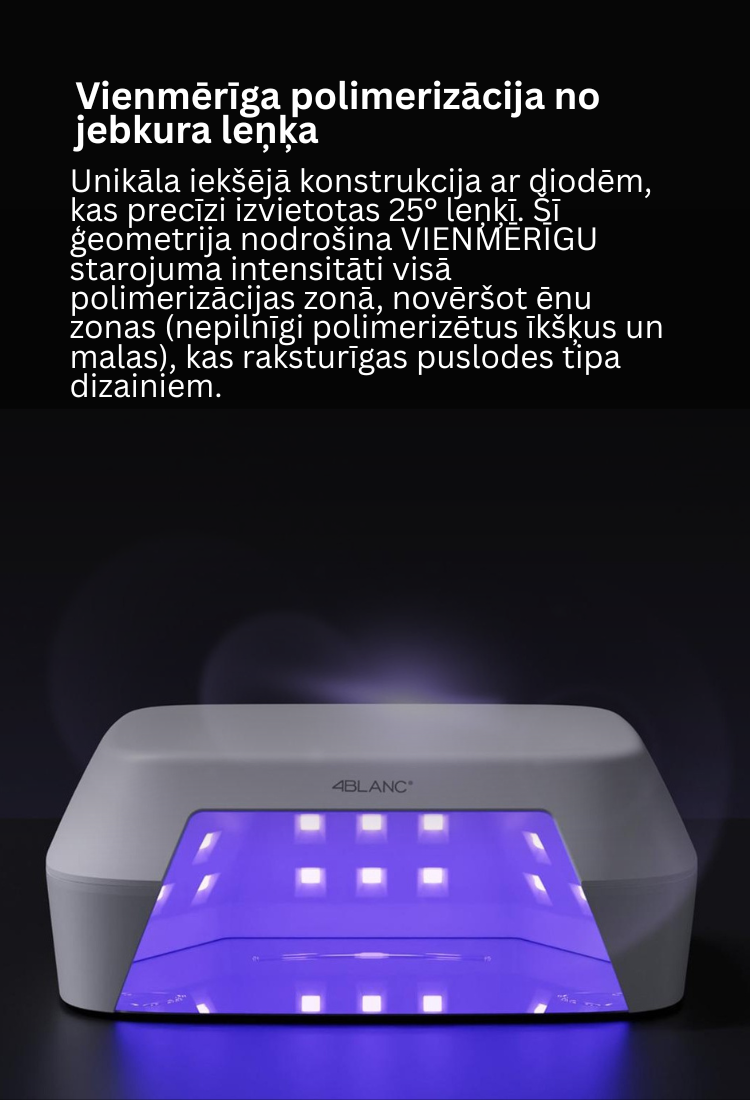 4BLANC Smart on juhtmega UV/LED-lamp, mis on mõeldud nii professionaalseks kui ka koduseks kasutamiseks, tagades kiire ja ühtlase kõigi geellakkide polümerisatsiooni. Lamp on varustatud Pure Gold Wire tehnoloogiaga, mis tagab seadme kogu kasutusaja jooksul stabiilse ja muutumatu valgusvõimsuse.