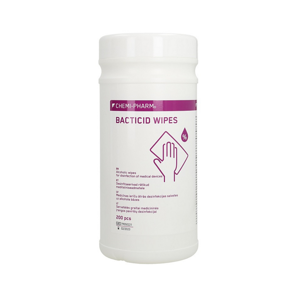 BACTICID WIPES omavad laia seenevastast, bakteritsiidset ja viirusevastast toimet, hävitades Gram-positiivsed ja Gram-negatiivsed bakterid, viirused ja seened, sealhulgas TBC, HBV, MRSA, Vakzinia, Herpex simplex, BVDV, Adeno, Popova, Rota jt. See on tõhus vahend kiireks seadmete ja pindade desinfitseerimiseks, mille suhtes on kehtestatud kõrged hügieeninõuded. BACTICID WIPES on salvrätid, mis on immutatud puhta, madala auruvusega etanooliga, et vältida personali hingamisteede allergiaid. Ei sisalda isopropanooli, kloori, aldehüüde, protamiini ega fenooli.
