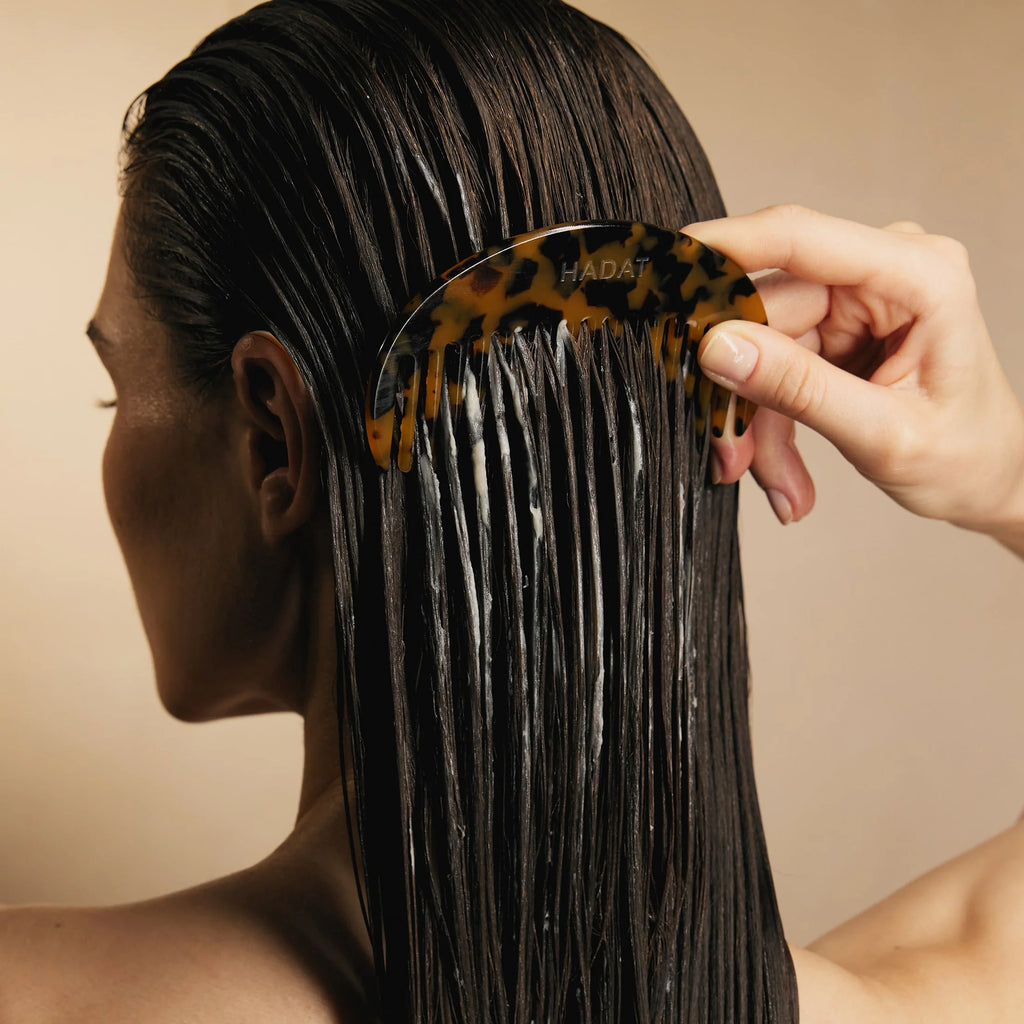 ● Masseerige väike kogus palsamit peopesadesse ja kandke ühtlaselt puhastele, niisketele juustele keskosast otsteni (vältides juuri).