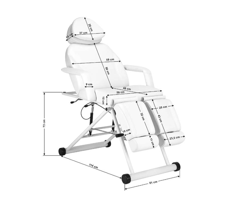 Tooli alusel on fikseeritud kõrgus, mistõttu iste asub muutumatul tasemel, tagades mugava kasutamise. Tugev metallraam mustades toonides tagab stabiilsuse protseduuride ajal. Peatugi on välja tõmmatav umbes 15 cm, pakkudes suurepärast tuge peale olenemata kliendi pikkusest. See võimaldab vabalt teha erinevaid protseduure, sealhulgas kosmeetikat, füsioteraapiat ja tätoveerimist.