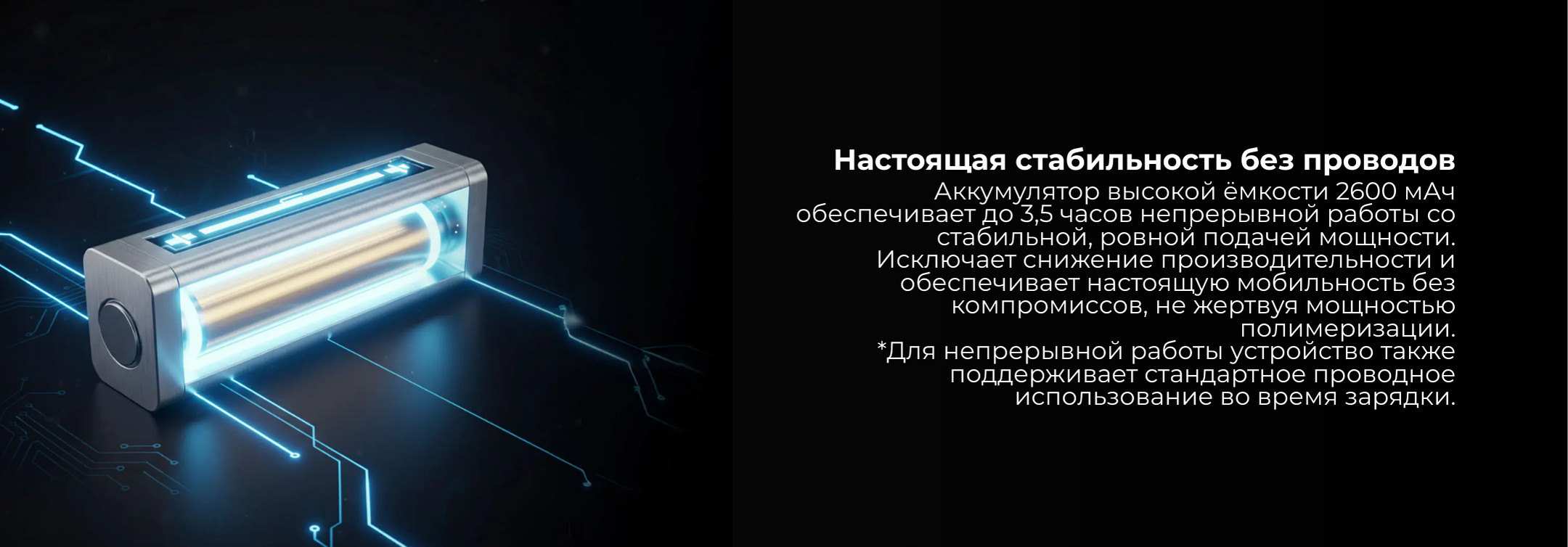 ✔ Беспроводное удобство — встроенный аккумулятор 2600 мАч обеспечивает до 3,5 часов непрерывной работы без кабеля
