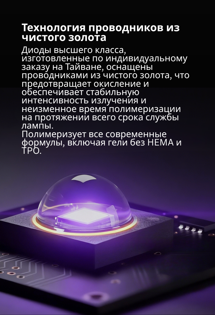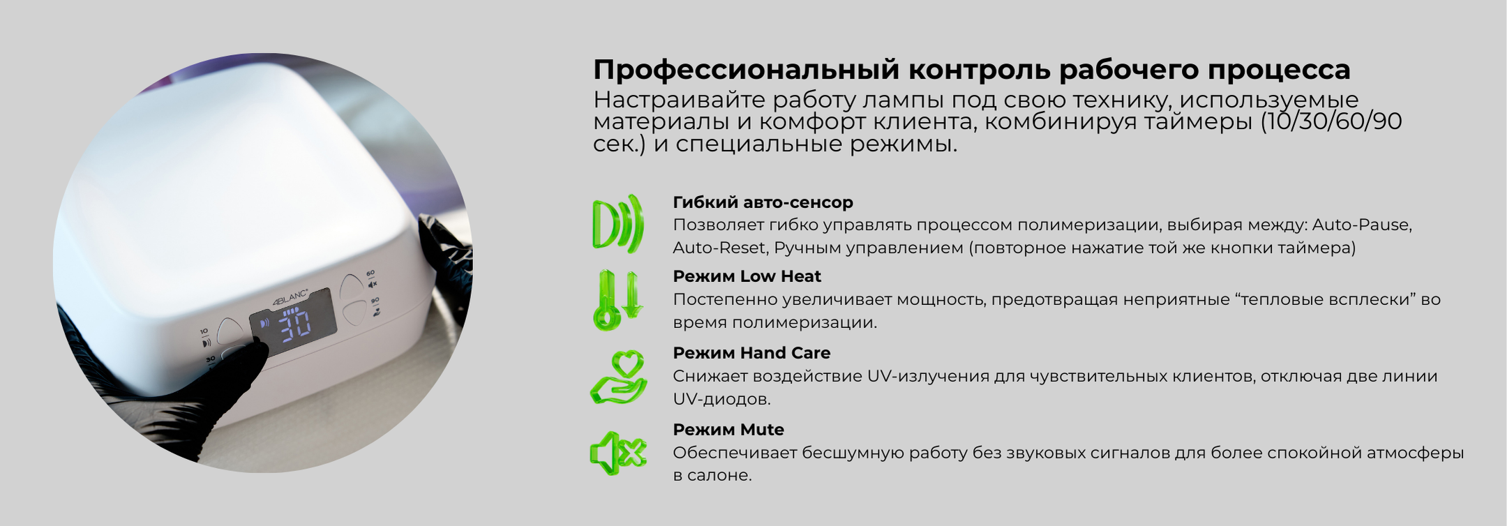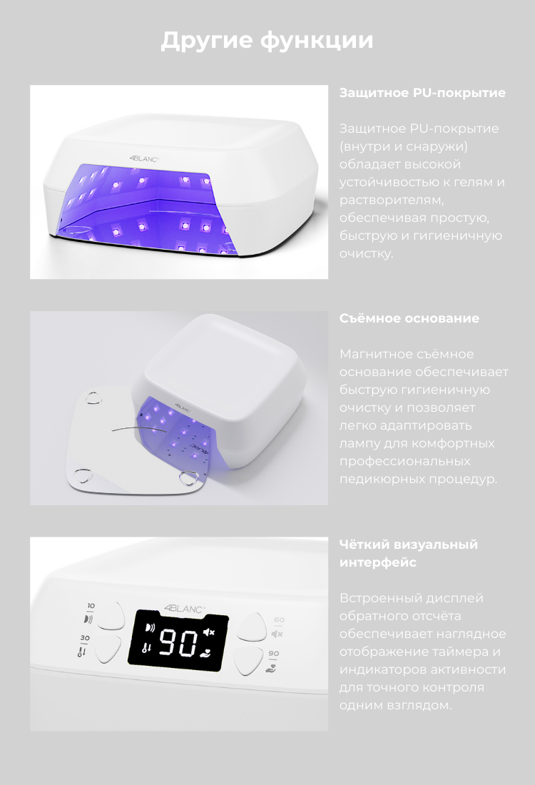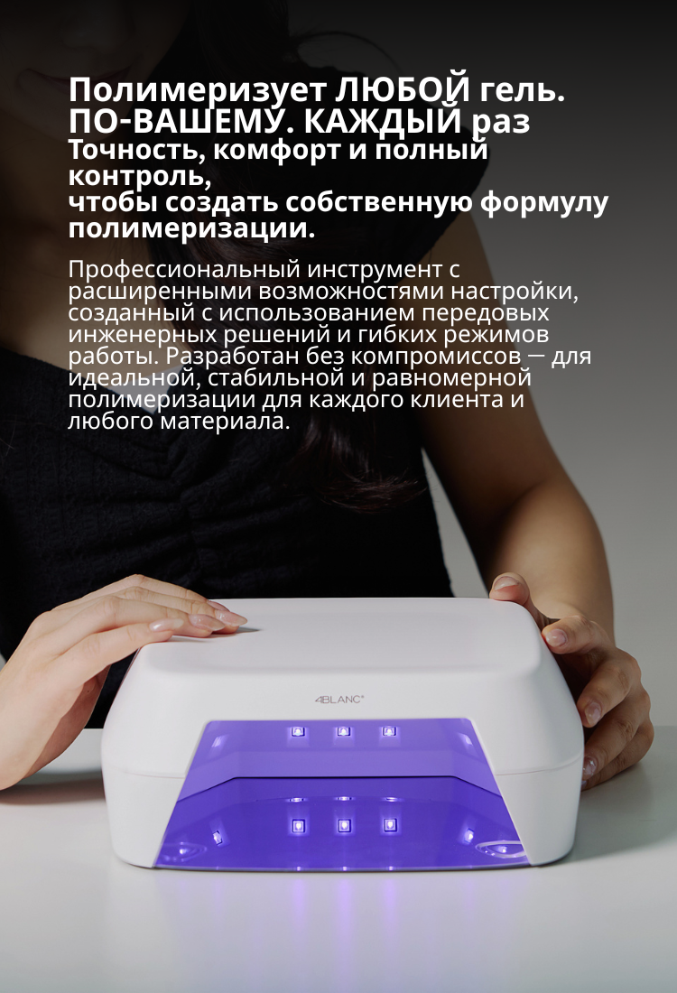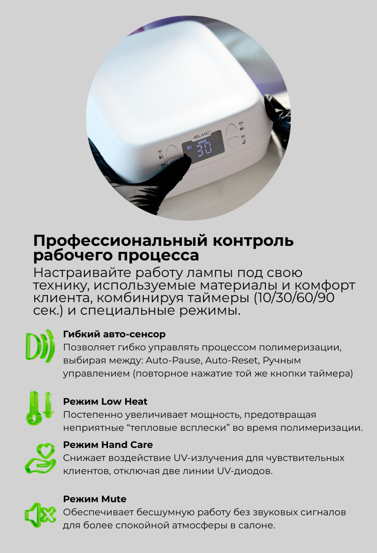 ✔ Многофункциональные режимы полимеризации — таймеры 10 / 30 / 60 / 90 сек, активация датчиком движения, ручной режим, режим Low Heat и режим Hand Care для чувствительной кожи